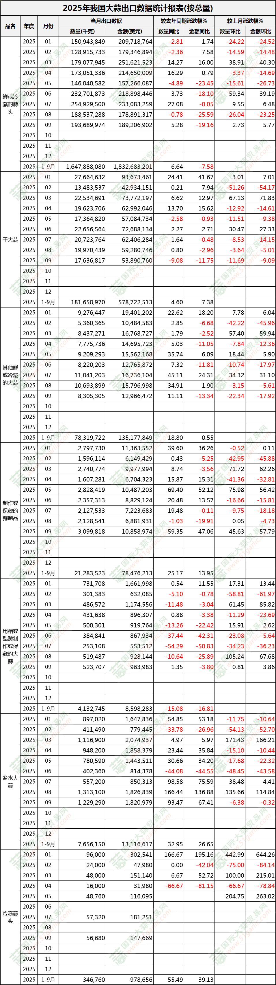 2025年9月大蒜出口數據(按總量)