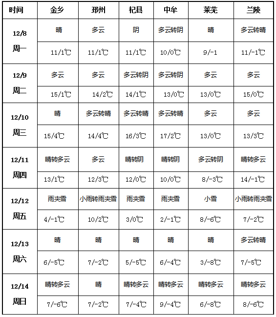 12月8日-14 日大蒜主產區天氣先暖后寒,前半周(12月8-10日)以晴、多云為主,氣溫在0-17℃;后半周(11-14日)氣溫驟降,最低溫跌至-8℃,12日多地出現雨夾雪、小雪等降水天氣。